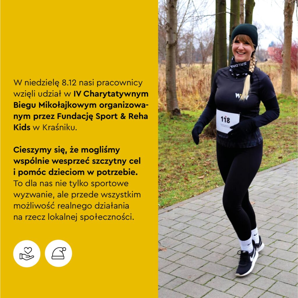 Sport, energia i wielkie serca – tak podsumowujemy udział naszej drużyny z Synergii w IV Charytatywnym Biegu Mikołajkowym w Kraśniku. Biegliśmy nie tylko dla sportowej satysfakcji, ale przede wszystkim, aby wspierać dzieci w potrzebie razem z Fundacją Sport & Reha Kids.